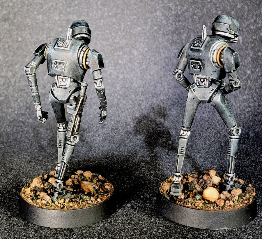 The Empire Riot Control Squad is a fun one, since it comes with droids AND stormtroopers, and they’re a rare case of Atomic Mass Games making units that don’t appear in movies. I figured I would start off with the KX Droids, and apologies in advance: my lighting setup over-saturated things a little, I promise they look less gray in person, hahaha!